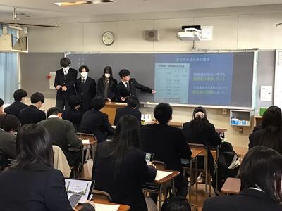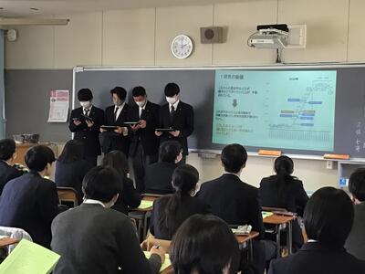 現在2年生は富谷市の様々な課題に取り組む「仮想市役所」としての課題研究に取り組んでおり、1月16日に宮城大学から事業構想学群の石内鉄平准教授と中沢峻助教を講師として招き、地域課題研究の各チームが研究について中間発表を行いました。
