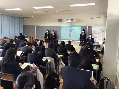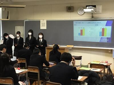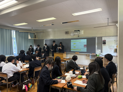 その代表チームを選出するための予選が、3月21日に行われました。2年生の各チームが工夫を凝らして発表し、生徒審査員である1年生は積極的に質問をするなど、活発に意見交換が行われました。