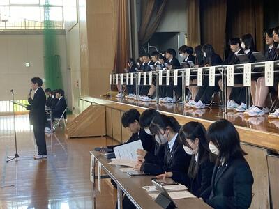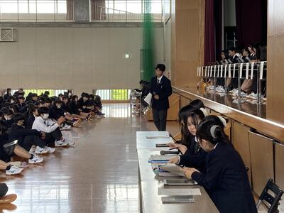 在校生代表として生徒会長から歓迎の言葉があった後、生徒会執行部が富谷高校の紹介をしました。