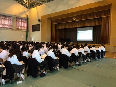 当日は、大学(文理別)、短期大学、看護学校、専門各種学校、公務員・民間就職の5つのコースに分かれ、外部講師の先生方から講話をいただきました。また、大学コースを選んだ生徒達には、年内入試で既に合格を勝ち取った3年生から、進路決定までの体験談を聞く時間も設けられました。3年生の中にはこの日のために自作のスライドを準備してきた生徒もおり、3年間の学習の進め方や受験との向き合い方など、後輩達に熱く語りかける様子が印象的でした。後輩達もその思いをしっかりと受け止めることができたようで、会の終盤には後輩達から発表者の先輩達へ、多くの質問も投げかけられました。