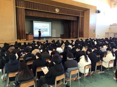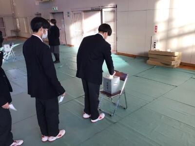 1月31日(火)6校時に,2学年全員を対象に『主権者教育に関する講演会と模擬投票』を行いました。宮城県選挙管理委員会の堀口陽平様,阿部和将様を講師として,選挙の仕組みや選挙の際に注意すべき点などを講演していただきました。その後,実際の投票用紙や投票箱を用いて模擬投票を体験しました。