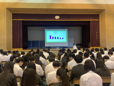 2年生がこれから富谷市に関する課題研究を始めるにあたり、富谷市の現状や課題を学ぶため、富谷市長若生裕俊様をお招きして講演会を開催しました。「住みたくなるまち日本一の実現に向けて」をテーマにした講演を拝聴することで、これから自分たちが行う課題研究のテーマ設定に対する一助となりました。