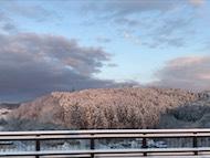 昨日の予報ほどではありませんでしたが、20センチほど降ったでしょうか。私は徒歩で学校へ向かいました。途中見えた、朝日と朝日に輝く木々はとてもきれいでした。