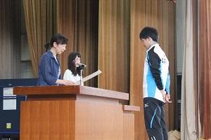 6月6日(木),6校時目に総体報告会と東北大会・野球部の壮行会が行われ,各部活動から総体成績・結果報告がありました。表彰式では,陸上部で種目:男子やり投げで第2位となり,東北大会出場が決定しました。また,弓道部で近的女子団体が第3位,射道男子団体が第1位となりました。
