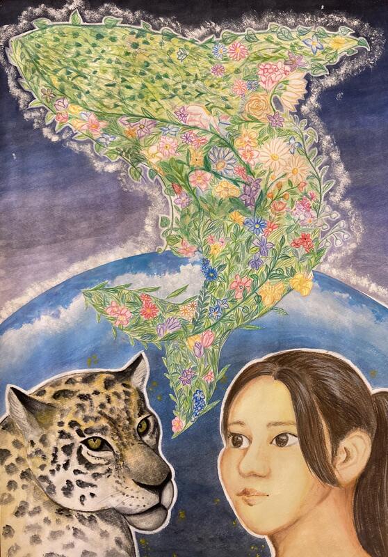 上記コンクールは、過去の災害の記憶と教訓に触れ、災害時に命を守る行動がとれることを目指し、関係機関と連携して実施しています。今年度は132作品の応募があり、美術部1年:関綾香さんの作品が特別賞を受賞しました。東日本大震災からもうじき15年…。甚大な被害を受けた南三陸町にある「防災庁舎」。その震災遺構を見上げる2人は何を想い感じているのでしょうか…、向こうの曇り空からは鮮やかな青空が見えています。