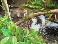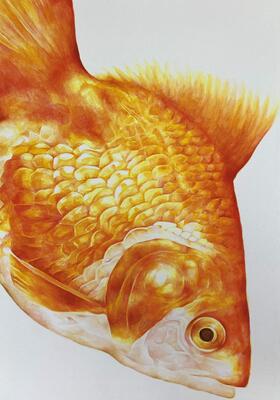 アクリル絵具(透明描法)で、赤やオレンジ、黄色の美しい鱗の金魚が、丁寧に細密に描かれています。光の当たり具合で微妙にグラデーション変化する鱗の様子や、金魚の構図(向き)・トリミングを工夫しながら、あえて背景を無色に表すことで、主題となる金魚を引き立て、見る人に様々な想像を巡らせて感じてもらうという意図も感じられます。