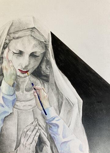 原画作品は、白い石像(マリア像)を緻密に表現し、そこに自身の手で彩りを施していく様子が描かれています。神聖な雰囲気の中、真摯に創作に向かおうとする姿、光と影がバランスよく構成された作品です。