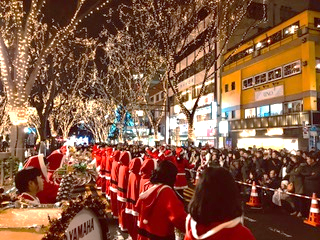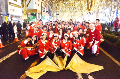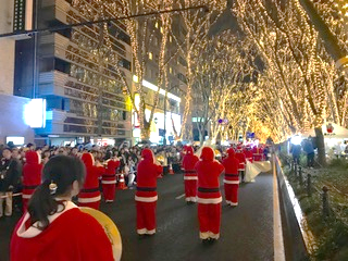 12月23日(日)仙台市の定禅寺通りで行われたSENDAI光のページェント「サンタの森の物語」に参加し,サンタの衣装を着てのパレードとブースでの演奏を行いました。少し雨にあたりましたが,予定通り実施され煌びやかなページェントの光の下,多くの観衆の前で楽しんで演奏演技ができました。