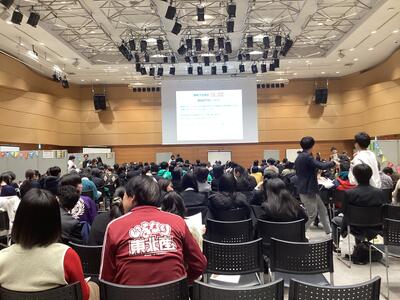 本校2年生が進めている富谷市のさまざまな課題に取り組む「仮想市役所」としての課題研究の成果を外部に発表する貴重な機会となりました。会場となったAER5階 仙台市中小企業活性化センター多目的ホールには、県内の高校生200名近くが集まり、いくつかのグループに分かれてそれぞれの研究成果を発表し、意見を出し合いました。