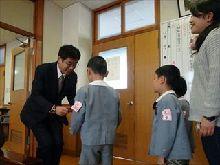 かわいいお客さんの登場です。成田中央幼稚園の園児3名と引率の先生が,「収穫感謝祭」の贈り物を届けてくださいました。校長室に案内された園児は,持参した果物を緊張しながら学校長に手渡していました。その初々しいしぐさに,感謝する心の大切さをこちらが教えられました。心洗われるひとときを,ありがとうございました。