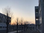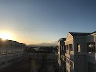 午後5時ぐらいに西の空を見ると、夕日が沈むところで、校舎が明るく輝いて泉ヶ岳もシルエットが綺麗でした。夕方の空は快晴で、明日からの天気の良さを期待させてくれました。