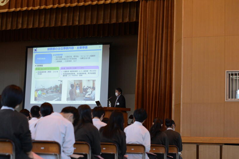 2学年T-time(総合的な探究の時間)における課題研究の一環で,富谷市講演会が開かれました。本校の課題研究は富谷市と全面的に連携し,協力をいただきながら行っています。市長の講演に加えて,富谷市役所の全7部の部長の方々から,富谷市のまちづくり計画について,詳しく講演していただきました。