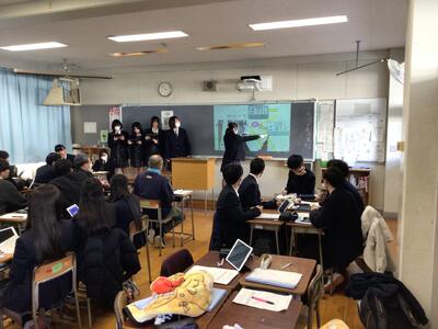 現在2年生は富谷市の様々な課題に取り組む「仮想市役所」としての課題研究に取り組んでおり、1月16日に宮城大学から事業構想学群の石内鉄平准教授と中沢峻助教を講師として招き、地域課題研究の各チームが研究について中間発表を行いました。
