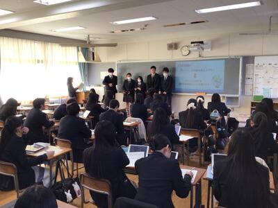 現在2年生は富谷市の様々な課題に取り組む「仮想市役所」としての課題研究に取り組んでおり、1月16日に宮城大学から事業構想学群の石内鉄平准教授と中沢峻助教を講師として招き、地域課題研究の各チームが研究について中間発表を行いました。