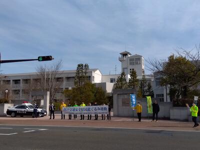 4月5日、富谷市の「春の交通安全県民総ぐるみ運動」の一環として、本校では交通安全の呼びかけを早朝正門前にて行いました。